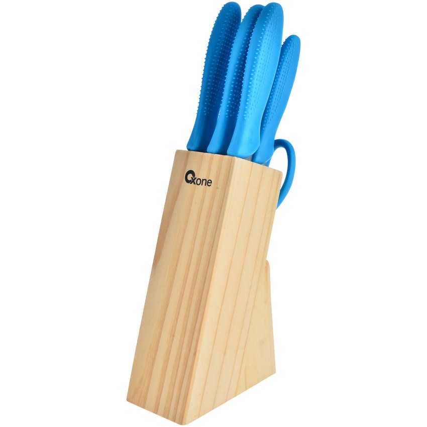 Oxone Set Pisau - 6 Buah - Biru adalah satu set pisau yang terdiri dari 5 pisau dan 1 gunting dengan gagang yang berwana merah muda yang dapat digunakan untuk memotong berbagai macam bahan makanan. Dilengkapi dengan raknya yang terbuat dari kayu. Produk buatan oxone ini sangat lengkap karena terdapat pisau dan gunting yang dapat membantu aktifitas Anda saat Anda berada didapur. Manfaat Set pisau ini berguna bagi Anda yang ingin mempermudah aktifitas Anda saat Anda ada didapur karena kelengkapan yang tersedia seperti pisau untuk memotong dan gunting untuk menggunting bungkus-bungkus plastik makanan pada saat didapur. Tersedia dengan 2 warna Set Pisau ini terdapat 2 warna yang berbeda yaitu warna biru dan warna merah mudah yang dapat disesuaikan dengan kondisi dapur Anda dengan warna yang tersedia pada set pisau ini. Gagang Plastik Dengan gagang plastik pisau dan gunting ini sangat nyaman dan mudah untuk dipegang. Bahan plastik ini membuat pisau ini sangat ringan untuk digunakan yang membuat Anda tidak cepat lelah saat memegan