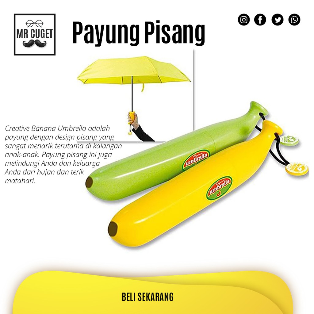 Payung Pisang didesign unik terutama untuk anak-anak karena sangat mirip dengan pisang pada umumnya, membuat payung ini terlihat menarik. Keunggulan lain dari Creative Banana Umbrella ini tidak terlihat seperti payung ketika dilipat.