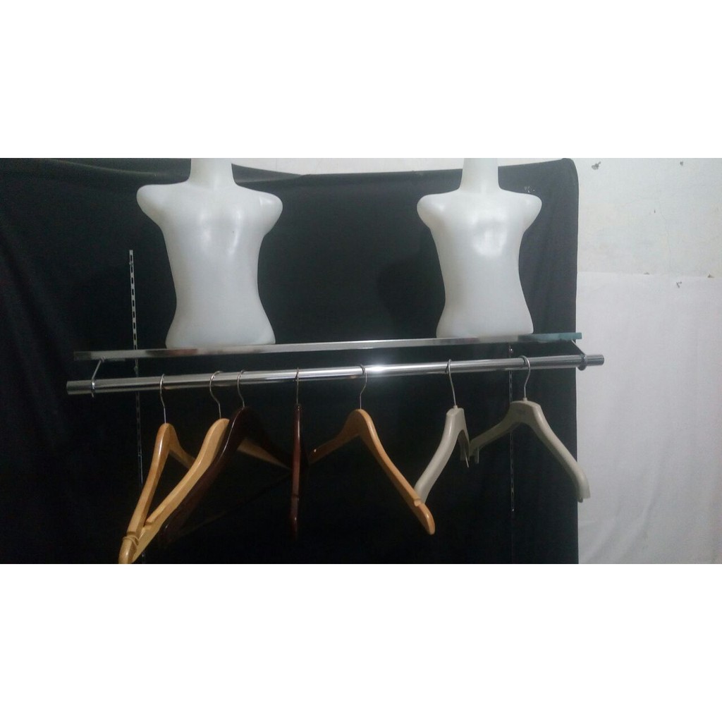 gantungan baju pipa bulat plus rak kaca di atasanya